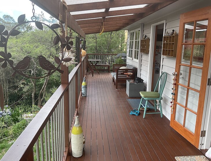 2 bedroom wooden cottage, 15 min walk to Blackheath village (upper Blue Mountains) with veranda and decks, lots of light, modern amenities and gardens.