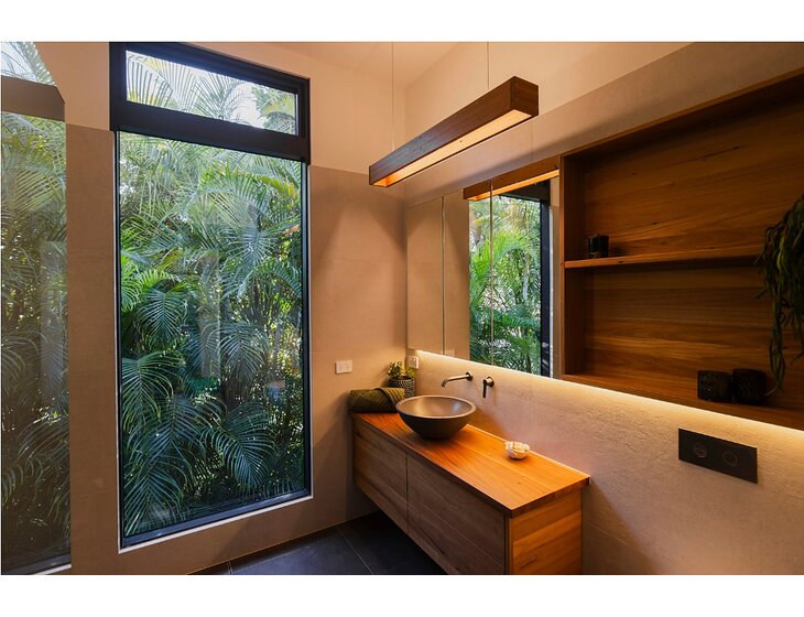 Please note that your living space is completely private and separate. We have a modern kitchen and a large open plan living area, which opens out onto an expansive back deck. Our living areas are all north facing and open onto lush gardens, with some views out over water. We’ve also recently completed a brand-new master bedroom and luxurious ensuite on the upper level, as well as a large contemporary laundry/craft space downstairs.