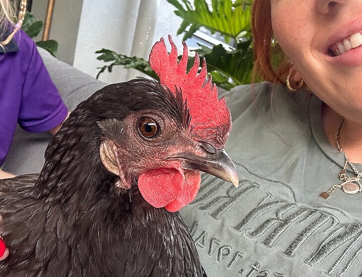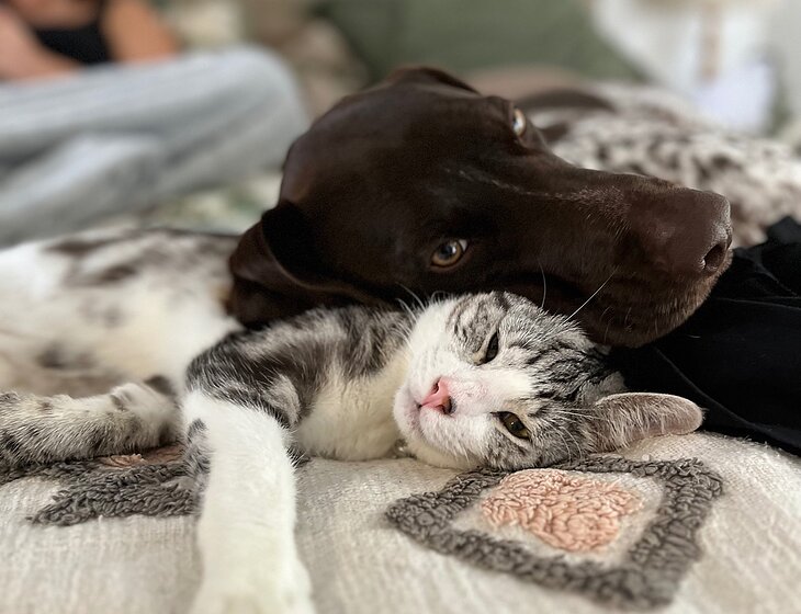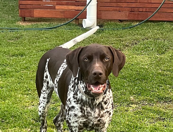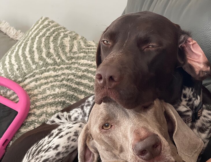 Winston is our nine-year-old Weimaraner, and Dexter is a 5-year-old GSP (German short-haired pointer). Sully is our 2-year-old cat. We also have chickens. The chickens require very little care as they have full auto feeders..