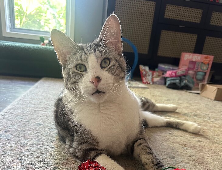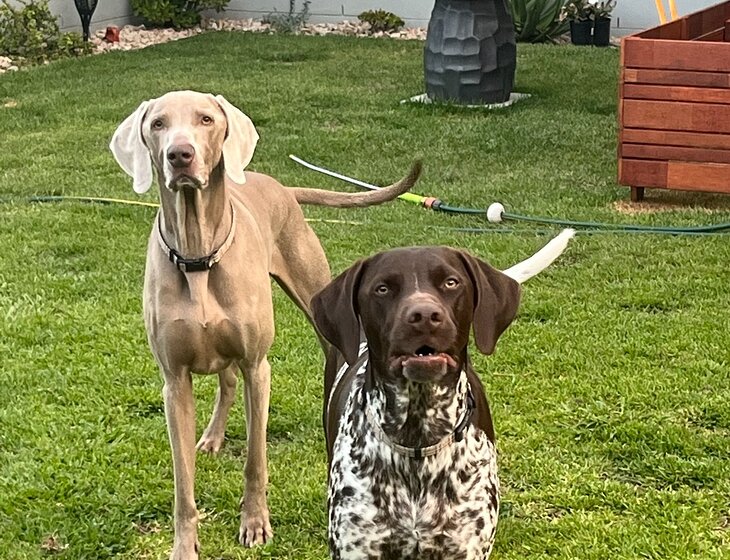 Winston is our nine-year-old Weimaraner, and Dexter is a 5-year-old GSP (German short-haired pointer). Sully is our 3-year-old cat. We also have chickens. The chickens require very little care as they have full auto feeders..