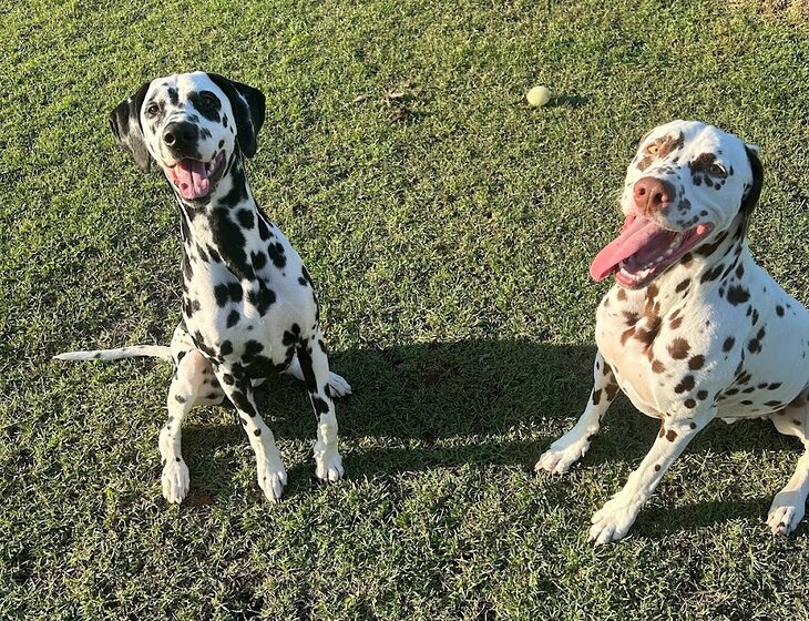Alfie (black spots) is currently 2 years old and is lazy compared to Darcy (needs half the exercise Darcy does). Alfie is much easier to walk if you prefer to walk, but he will also chase the ball or frisbee in the yard.