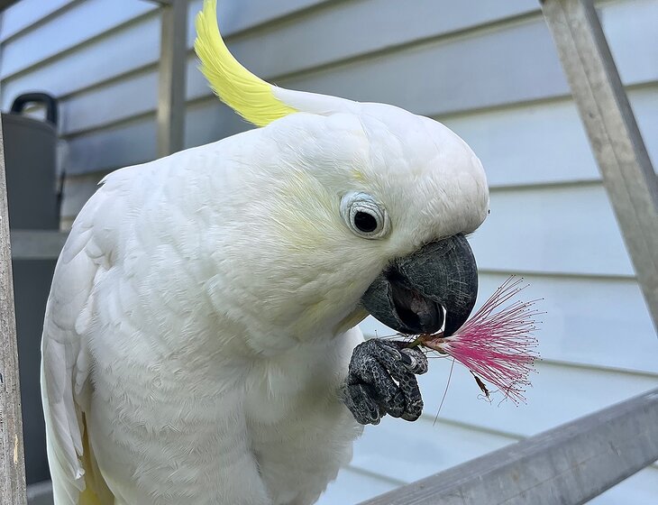 Our cockatoo Penny is easy to care for. Her self-watering bottle and seed tray just need topping up as needed. She enjoys branches and nuts in shells to keep her entertained.