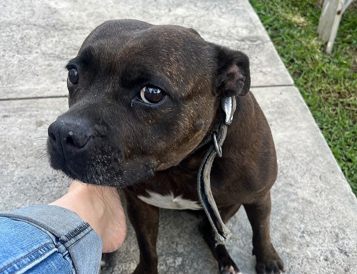 Ellie, an English Staffy, and Charlie, a Schmoodle, are our two friendly, older dogs. They spend their days outside and sleep in their crate in the lounge room at night. As we have family members with allergies, the dogs aren’t allowed to roam inside or be on furniture. They only need short walks to the waterfront, as they are both slowing down in their old age.