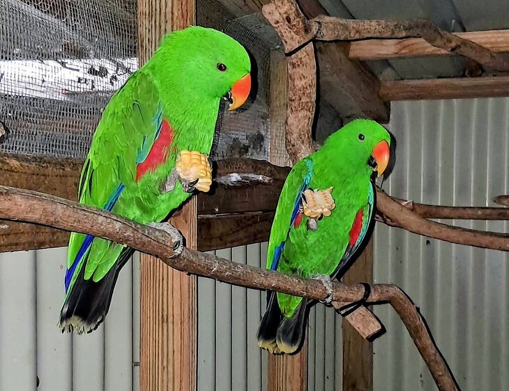 Two Eclectus parrots Jasper and Eden, Pygmy dragon Winston, Canary Bridget. General care, feeding and cleaning up after the fur babies is really important.