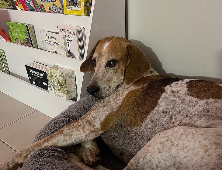 Gemma is an 8 year old English Foxhound who is super chill; just needs a small walk or off leash run per day. She is otherwise happy to lounge around.