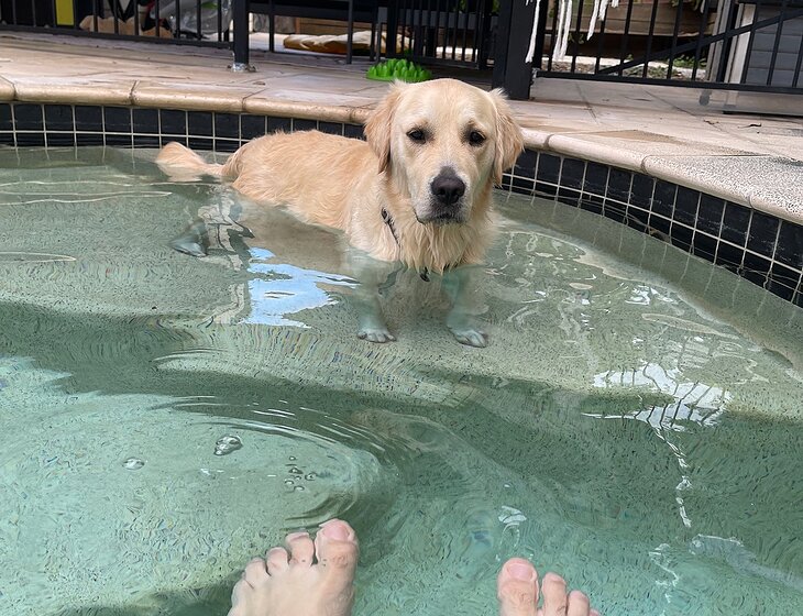 5 bedroom house with a pool. Two golden retrievers and a cat to look after. Chunk and Nugget the dogs are very happy and want to be everyone’s friends, they are very good with children and babies. Easy to look after house.