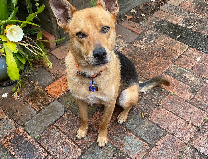 Rocco likes a daily walk and as many games of fetch as you can manage. He’s an indoor/outdoor dog, and is happy to sleep on your bed or by the bed on the floor. He’s happy to be left indoors on his own when you go out.