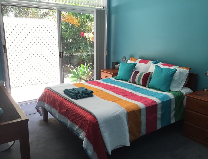 Single storey modern home in leafy green Buderim on the Sunshine Coast with sub-tropical garden, RVC conditioning and fans, wifi. Pleasant, comfortable and private guest room has RVC aircon and fan - separate bathroom with corner bath.
