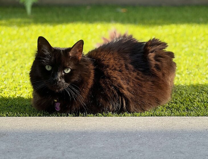 She’s fed a mix of wet and dry food, and we simply keep her bowls topped up. Other than that, she’s very low-maintenance and will happily do her own thing.