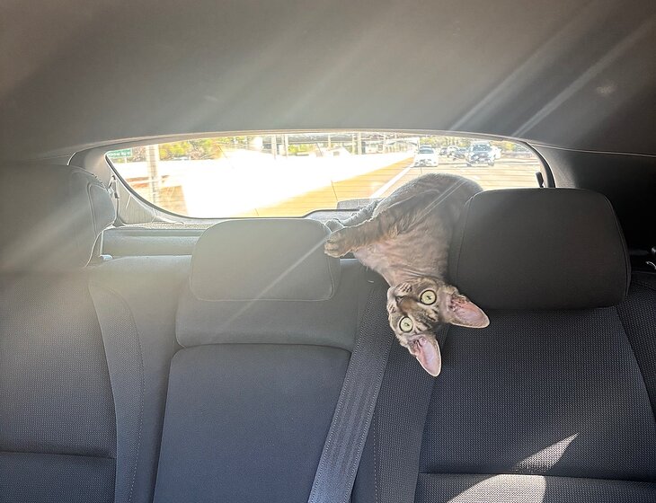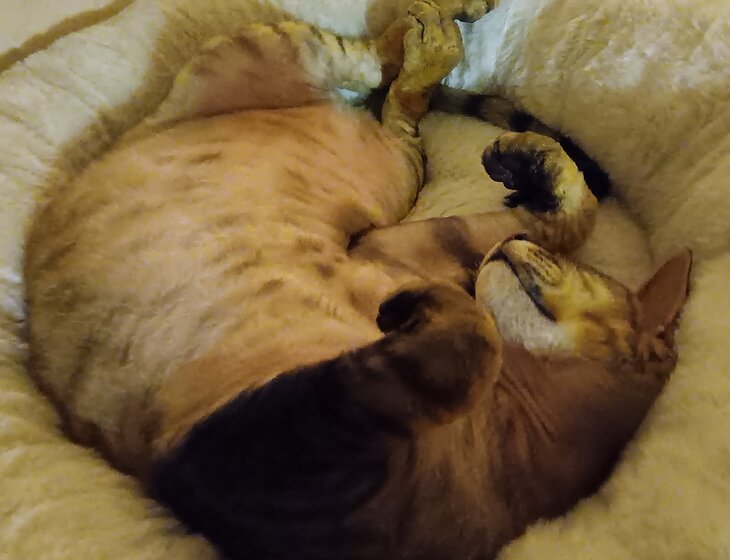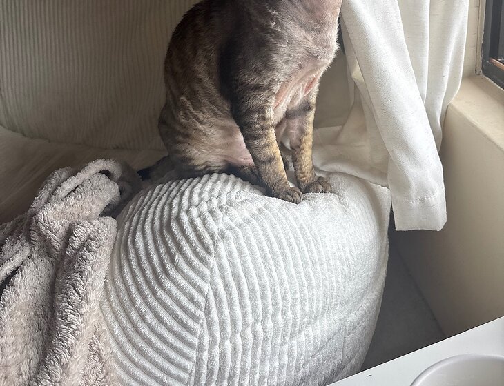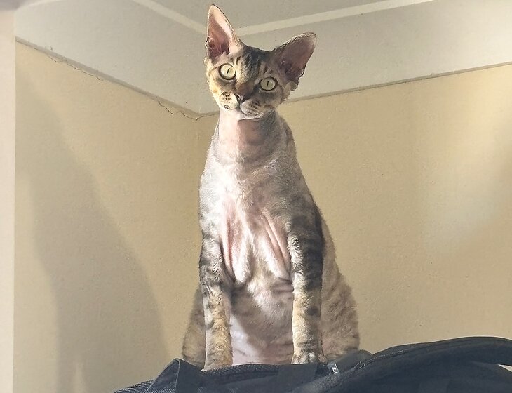 We have our beautiful 1 year old Devon Rex x sphynx boy cat who is an absolute joy.