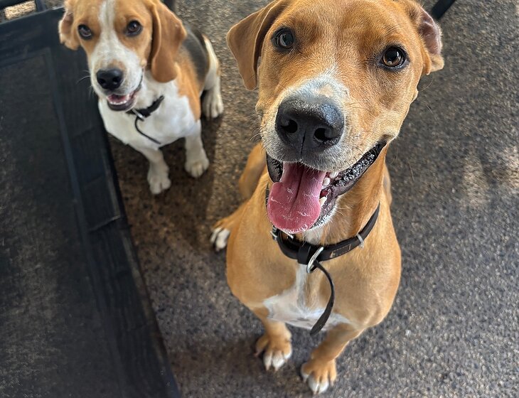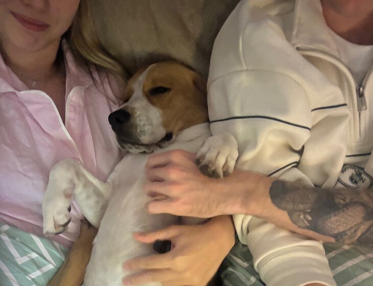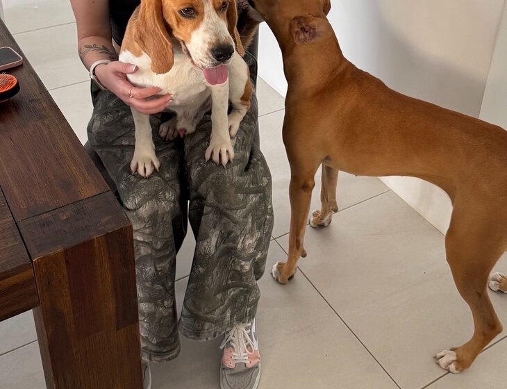 I have two beautiful dogs, a ridgeback and a beagle, who love to cuddle.