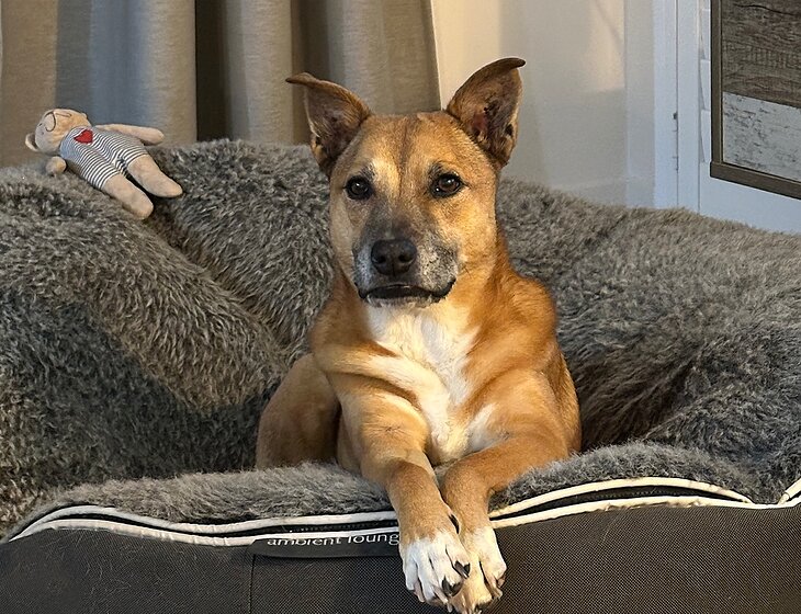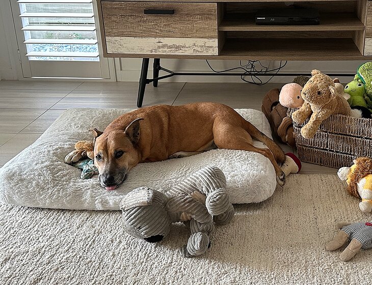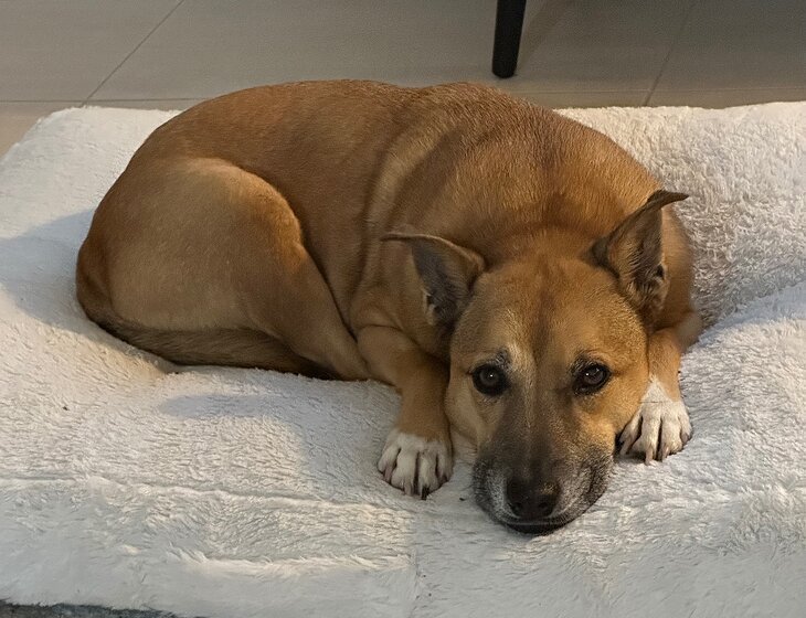 Rusty is friendly and affectionate with people, less so with other animals. She loves to snuggle and give kisses. She is most comfortable and relaxed in one of her many beds watching and listening to television and intermittently snoozing.
