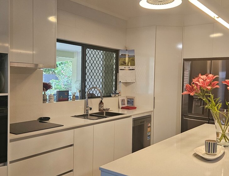 Newly renovated 3-bedroom home close to all facilities in Smithfield, large outdoor under cover balcony area that is about to be tiled and overlooks private rear yard with a lovely, treed view. Fully air conditioned and secure property in exchange for minding our loveable 5.5-year-old Labradoodle, Kirra and feeding our friendly one-eyed cat, Missy. Trinity beach is only 10 minutes away and Kirra loves her morning walks at the beach.