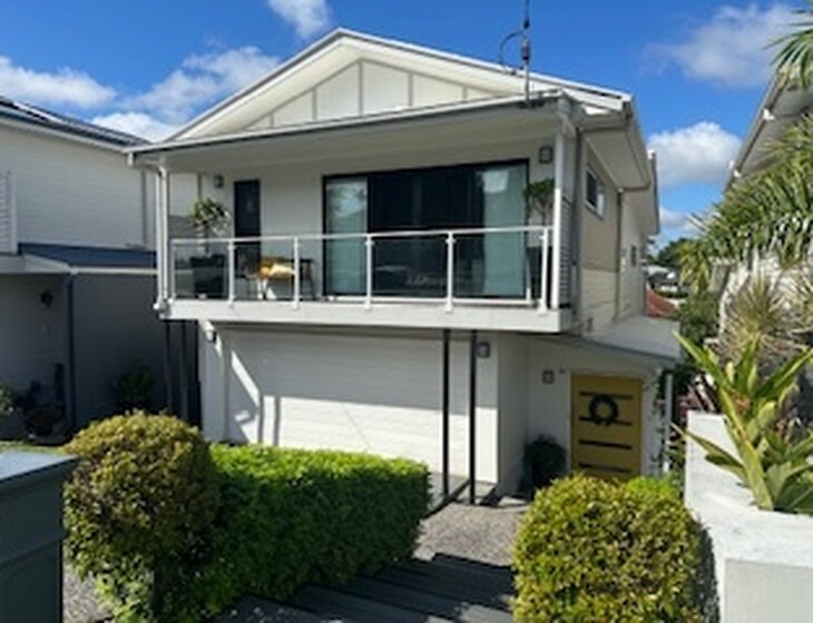 High set modern home, built over several levels, so has stairs. Outdoor deck off kitchen, dining , lounge area with city glimpses. Office area available for use.