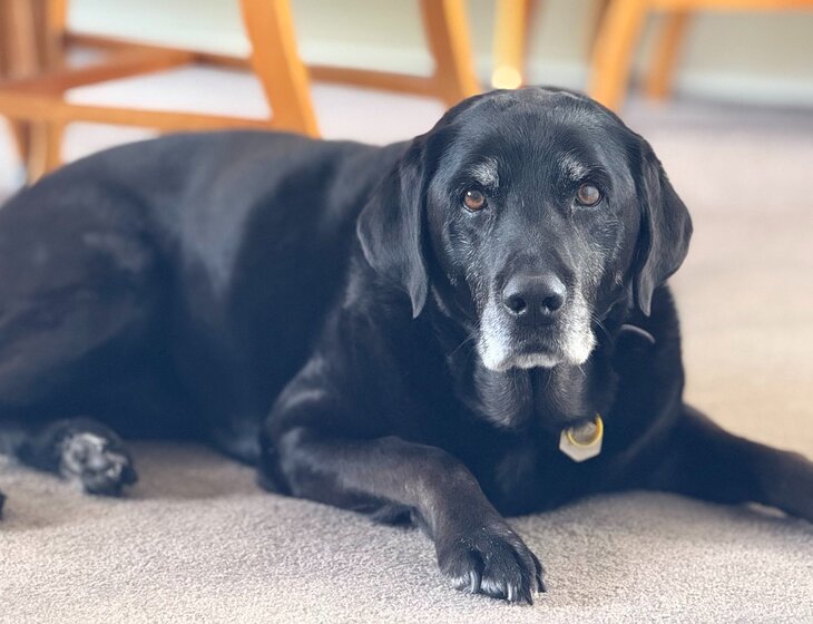 Care needed for mature female black Labrador (Amber), predominantly indoor dog, happy to be outside during the day but must come in at night. Short daily walk. Very friendly dog, loves attention and just being with you.