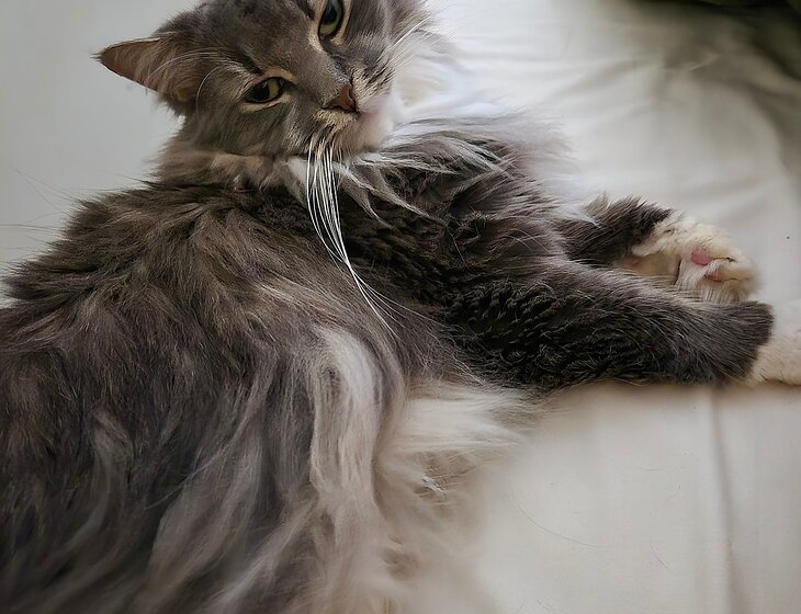 Bibi is very easy to take of. She's an extremely gentle cat and enjoys affection from people. She would just require feeding once a day, litter emptied, and a little bit of love when she's asking for it.