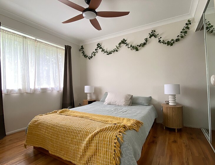 You'll be staying in the master bedroom which comes with a queen bed, bedside tables and a ceiling fan. There is a desk with monitor downstairs in the living area that you're welcome to use as well. There is off street parking available for one car and plenty of street parking. There's a sofa bed in the third bedroom, so also works for two friends.