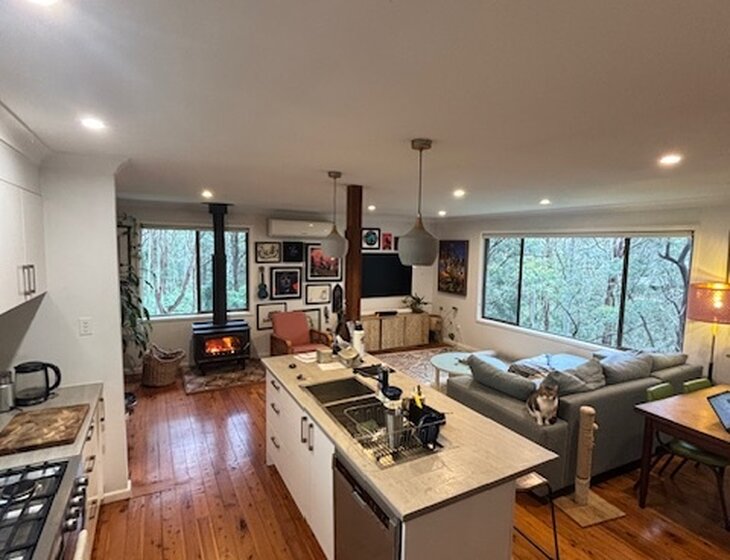 We live in a newly renovated 4 bedroom house in Charlestown, surrounded by bushland. The main house consists of 2 bedrooms, office, bathroom and open plan living room/dining room/kitchen. There is a large garden and deck with an outdoor cinema, bbq, fire pit and herb garden. There is also a separate art studio/guest bedroom. The house is at the bottom of a quiet cul-de-sac and the garden backs onto a reserve, we are often visited by lots of wildlife. Our neighbours are lovely.