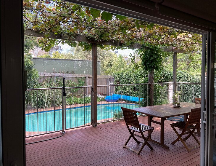 Our single story house is situated on a largish, well treed block in a cul-de-sac in the golf course area of Cheltenham-Beaumaris in Melbourne. Around us are two golf courses, sports fields and ovals and Cheltenham Park, so there are plenty of lovely areas to walk. The local shopping strip (Sea View) has great coffee shops, chemist, supermarket, etc and is only 12 minutes walk away, with the large Southland shopping centre a 7 minute drive away. Our nearest beach, Ricketts Point, is a 7 minute drive away and we also have a 24/7 dog beach, which is great for walking the dog.