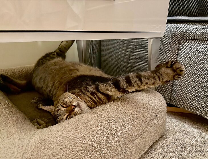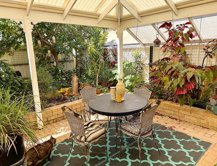 She has her beds she likes to sleep in - one is next to my bed under the bedside table and there is another one outside under the patio. Sometimes she sleeps in the garden. She likes to wake you up by jumping on the bed and chatting to you while demanding cuddles. She is an outdoor cat who is fed twice per day and there is a cat door in the laundry allowing her to move freely. I also have a few pot plants that need watering a couple of times but the rest of the garden is on retic. Read more...