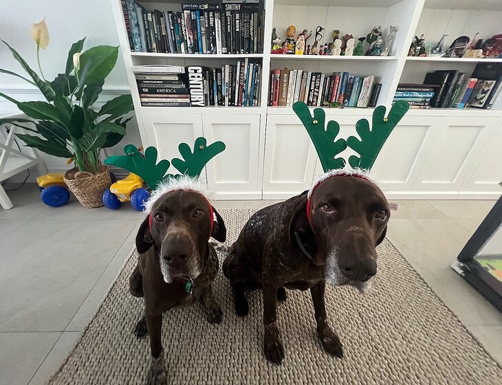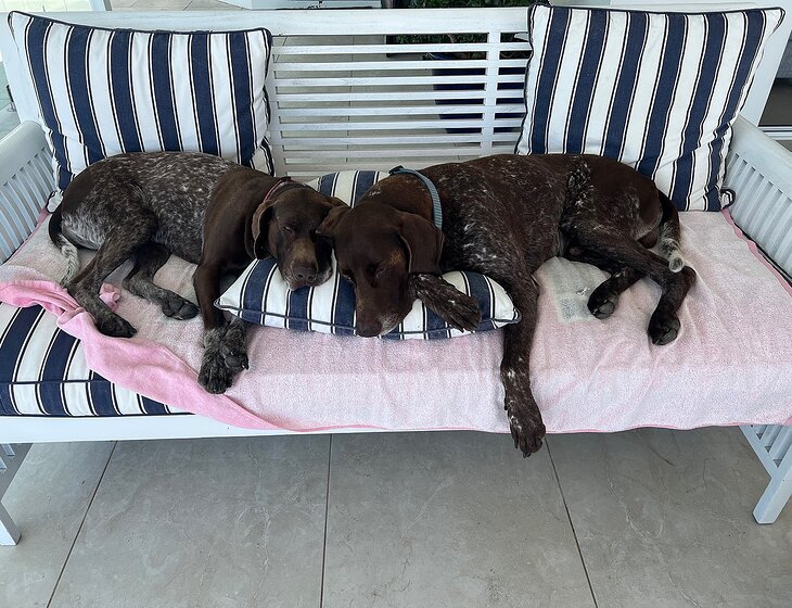 Two storey home on the main canal. Two German Shorthaired pointers,11and 8. They need two walks a day and one feed per day. They like to hang out with their people (we are retired). No lawns but a pool and spa and some pit plants to water.