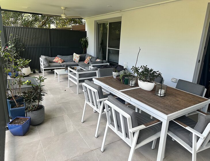 We live in a ground floor unit which has a very large balcony overlooking community gardens and trees and an off street car parking space.