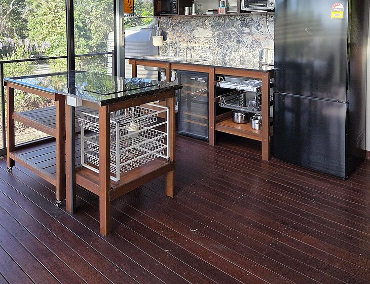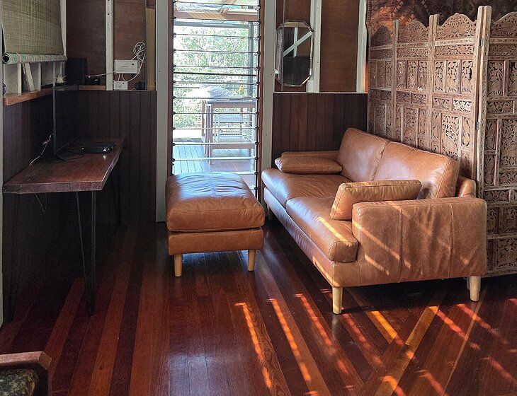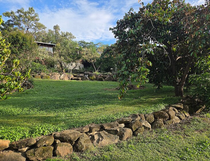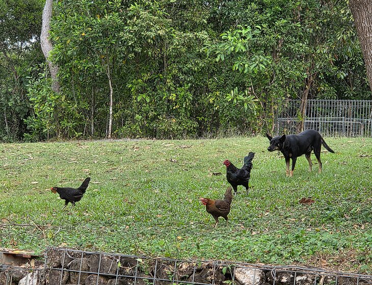 1 hectar on the Endeavour River, half of which is land for wildlife. The other is a diverse garden. I have a self contained dwelling, seperate to where I live. I have 2 kelpies, 1×15 year old male, 1×7 year old female, they are outdoor dogs that require daily walks. I also have 8 chickens that require minimal care.