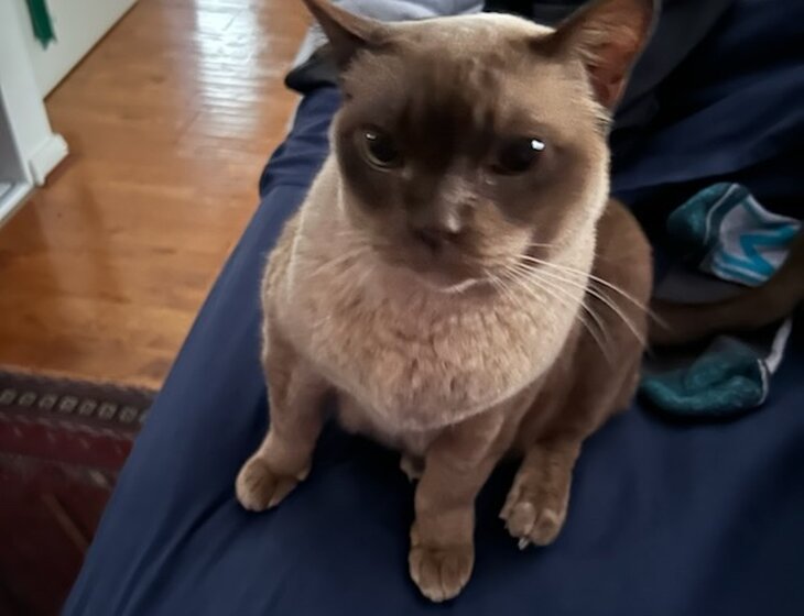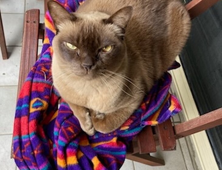 The cat, Keating, is a 15-year-old, very friendly & talkative desexed Burmese boy. He loves nothing more than to curl up in his bed on the enclosed front balcony, or better still, on your lap or in the bed with you. He has very easy to administer dietary requirements. He requires some medications, which are just sprinkled & mixed into his food with water. He has some kidney issues, so he has to be monitored daily to ensure that he’s eating, drinking & toileting. He is fully vaccinated.