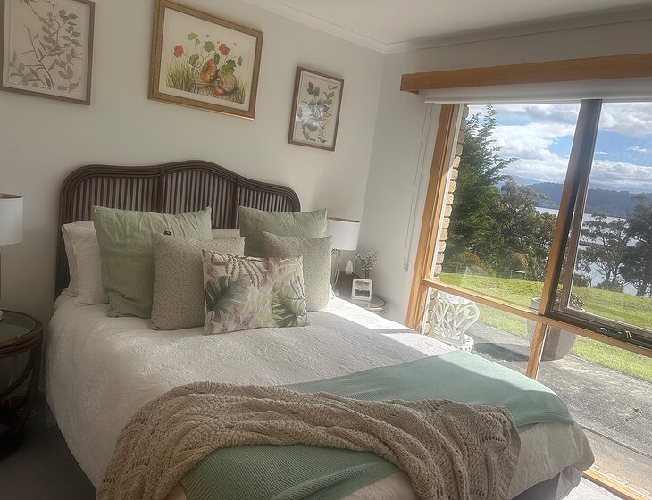 Lovely single-level, well-appointed brick home on five easy acres between Huonville and Cygnet, with expansive water views across the Huon River towards Franklin and the Hartz Mountains. We’re only 40 minutes south of Hobart. The house is spacious, comfortable and private, set on a beautiful acreage with orchards, open views and a small children’s park. It has full air-conditioning, a wood fire, reliable internet and a self-contained office. It’s also an excellent vantage point for aurora sightings, especially in winter.