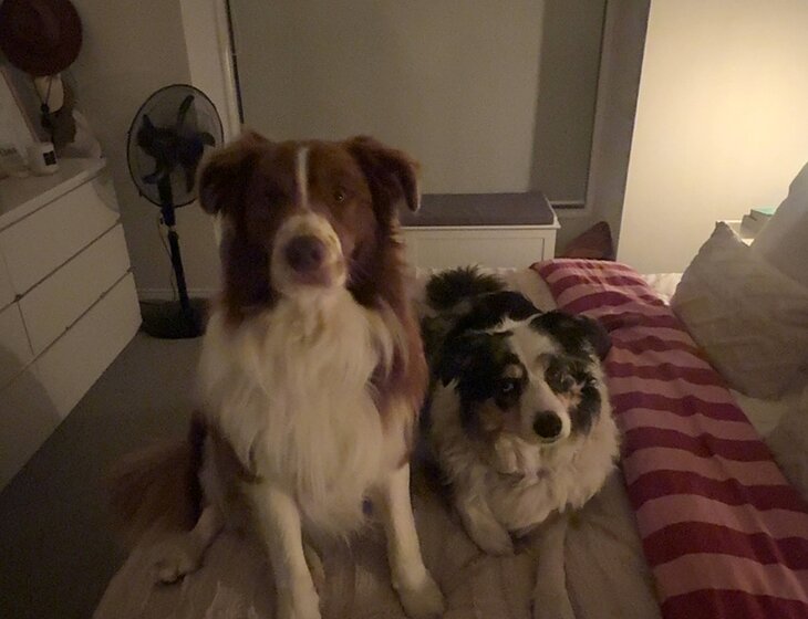They are outside all day while I am at work, then we go for one large walk 3 to 5kms (walking track) once I am home. Milo loves fetching the ball and Luna enjoys sniffing. There are parts of the walk I let them off lead and will always stop or come back to you for road crossings, Luna is territorial with other dogs so if i see one they both go back on the lead.