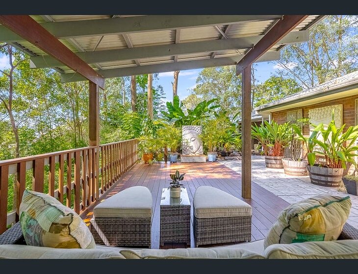 Lovely Balinese style house only 3kms from the beach, in a glorious bush setting with native animals galore. Need to be here at least early mornings, evenings and overnights (this might be negotiable), to keep my precious indoor-only kitties safe and loved. Prefer a couple, or single person. No smokers, please. No children. Two cats have medication needs twice a day, so you'd need to be familiar with how to use an asthma inhaler tube, squirt liquid med in mouth, and the other cat needs meds rubbed inside her ear. Both cats are very used to it, and as long as you stick to the routine we will show you, it should work out fine. :-)