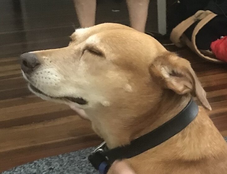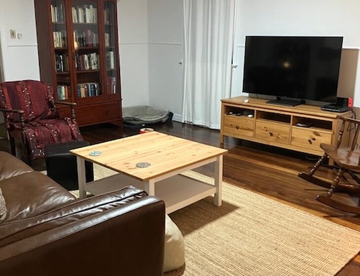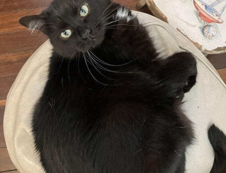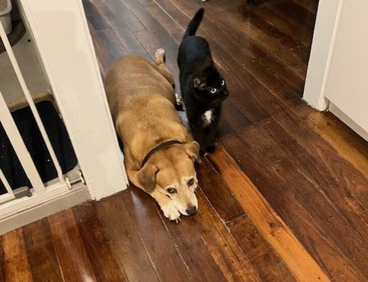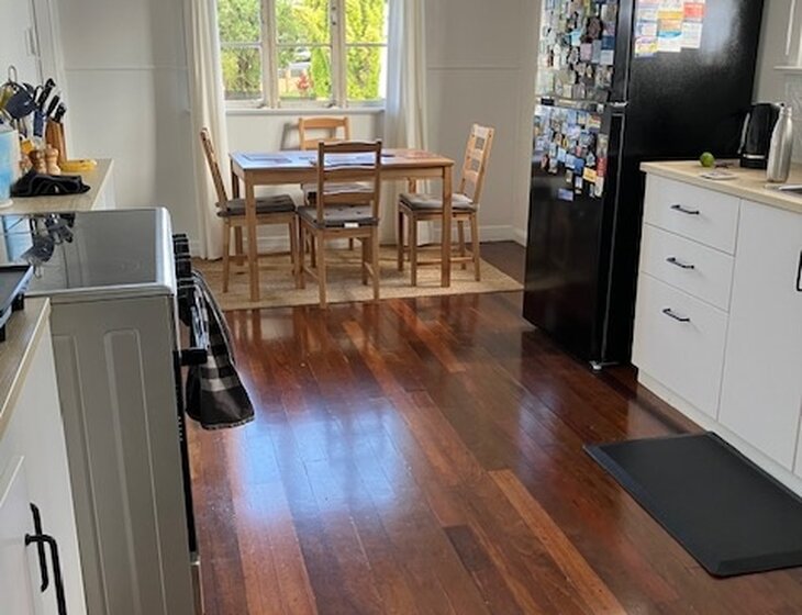 Our dog, Rio, is 13 years old and very sweet. She is a medium-sized staffy Australian cattle dog cross. She is okay being at home on her own for some hours but generally one of us is home most days. We give her a 30 minute walk at night. Manita, our cat, is 9. She sleeps on the bed all day and comes to get you when she wants to eat.