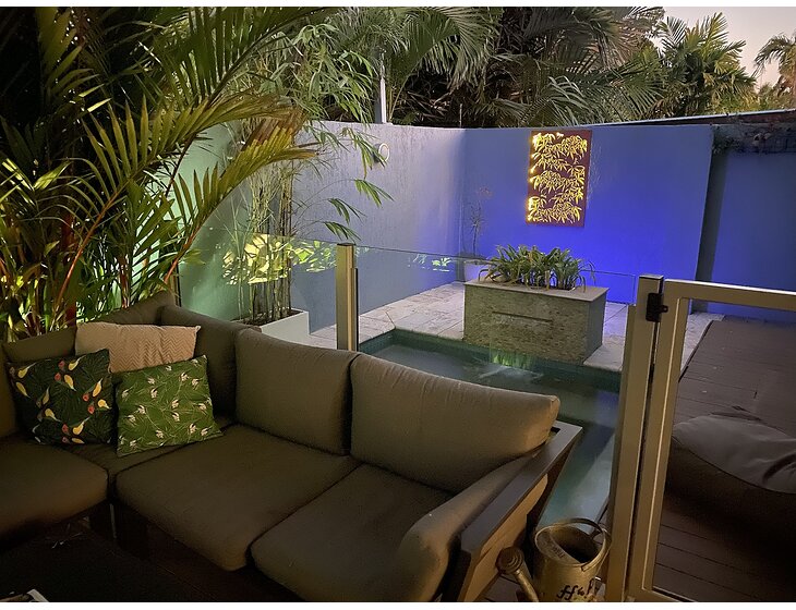 Our two-storey townhouse features open-plan alfresco living, a private plunge pool, outdoor shower, and entertaining deck surrounded by tropical gardens. Air-conditioning in every room keeps things comfortable year-round.