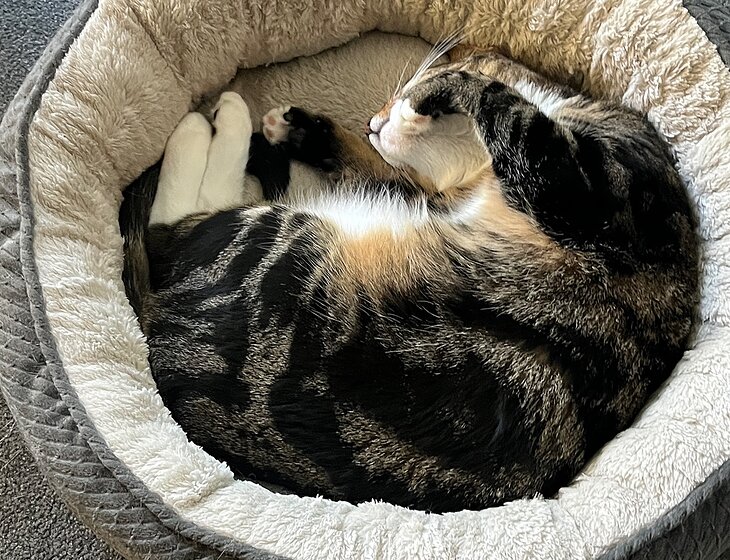 Coco was adopted from a shelter. She’s still very nervous and does not like to be picked up but she’s extremely affectionate when laying in bed and when she earns your trust.