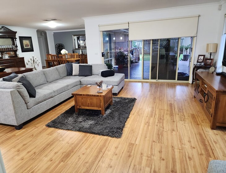 We have down sized to a 5 bedroom home on a 750sqm block. The gardens are easily managed including a small vegie patch. Our black lab Argo is as well behaved as a retired gent in his late 90s should be. He is well behaved but is 13yrs old and not as agile as he once was.