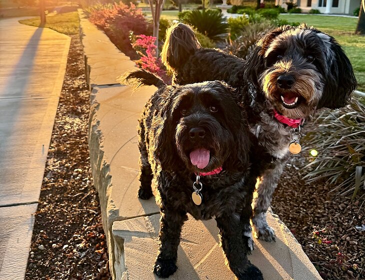 We have 2 very human Labradoodles (Molly & Kiki) that will need caring. Just feeding once a day and company. Kiki is 7 and Molly is 8 years old, house trained and very easy going- low energy they just sleep most of the day. They enjoy being inside and outside but sleep inside in their beds. Walking is not a requirement we would rather them just stay in the safety of our yard and home.