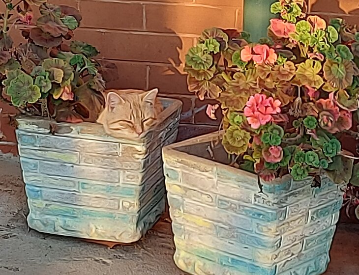 Outdoor cats. Care involves putting out milk and dry cat food in the evening and keeping cat bowls clean.