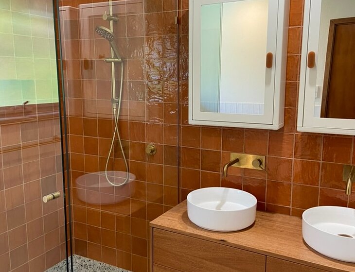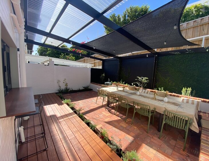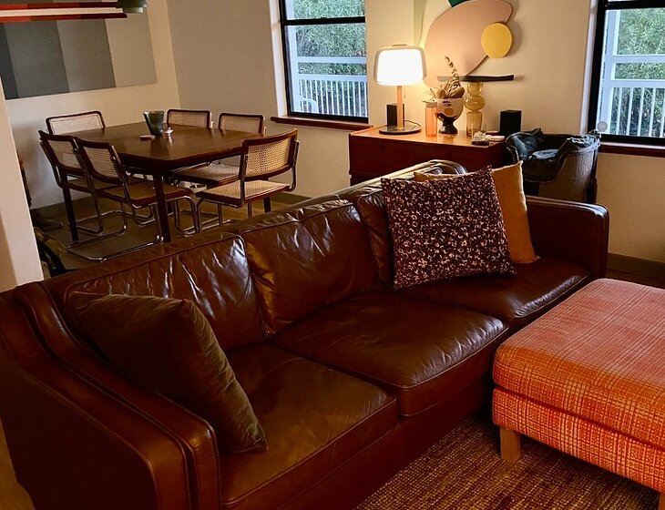 Our newly renovated mid-century modern East Fremantle townhouse has a large master bedroom with a king size bed, a second bedroom with a single bed, and one bathroom. There is a garage on the first floor, a living area on the second floor with a balcony and courtyard, and the bedrooms and bathroom on the third floor. It is located an easy walk from the Swan River and is well connected to bus routes into Fremantle (a 5-10 minute drive away) and Perth city.