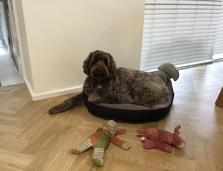 “What a wonderful time I had with Barney! He is a sweet, gentle, loving, soulful boy who's keen to play a little fetch inside with his favourite stuffed toys, and cuddle on the sofa in the evenings while you read or watch TV. He kept me company during the day while I worked and studied, napping in his bed beside the desk. He's good in a lead, enjoys his walks, and is quick to give a guest alert.