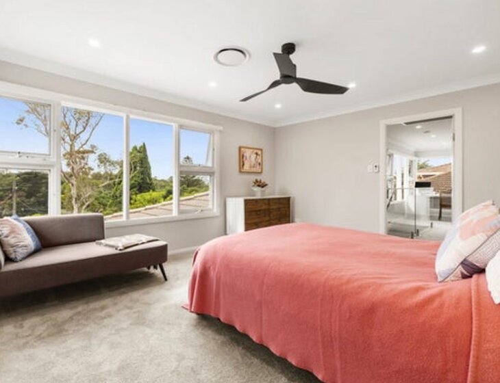 Master bedroom has views over trees on the third floor, open sky with morning sunlight streaming in. Comfortable king size bed and smart television with large modern ensuite. Bed linen and towels are premium quality. Reverse cycle heating and cooling with a timer.