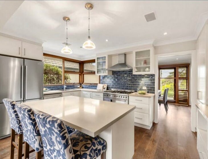 Large eat-in kitchen with island bench, including a six burner stove and 90cm oven. This leads to the outdoor entertainment area with BBQ overlooking the pool and garden lights.