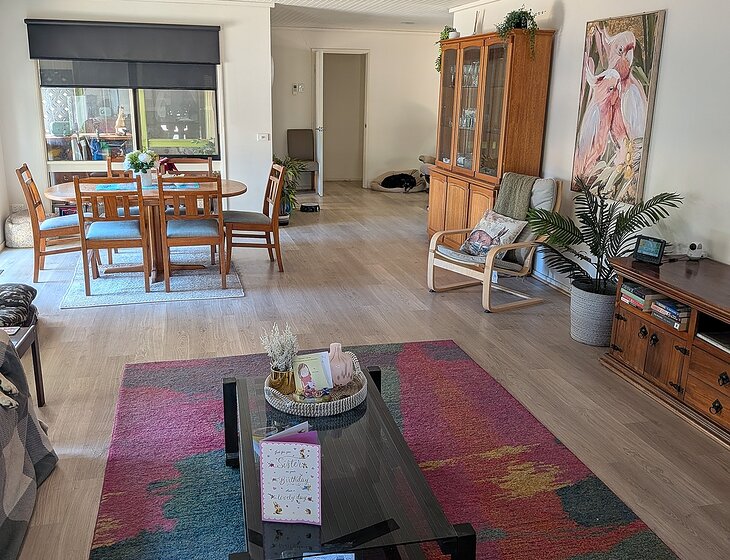 Our home is in country Victoria in Echuca on the Murray River. We have 3 bed rooms ,on suite & bathroom. Its approx. 43 years old with a modern kitchen, modern floor boards, generous backyard, large pergola on side of house. The 2 bedrooms are at the end of the house separated by the bathroom and can be closed off by a hall and door. All doors have security screens for cross breezes in the summer. We retired here 4 years ago and love living in this town. There is a lot to see and do in Echuca ,fantastic restaurants, plenty of coffee shops, and small retail shops. There is a lot of history here to see with the beautiful architecture preserved.