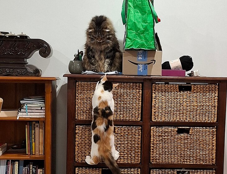 I have two cats called Amelie and Terry who are indoor cats, although Terry gets time outside on a harness and leash as he formerly was indoor/outdoor. They are pretty self sufficient, but Ammy is still a kitten and will get into any bags left open!