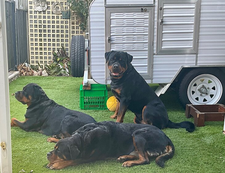 Sitters to stay, play with three large dogs and feed them twice daily. We have three Rottweilers who live inside/outside and a “no fear of breed” is a must as the dogs feel it when people are fearful of them.
