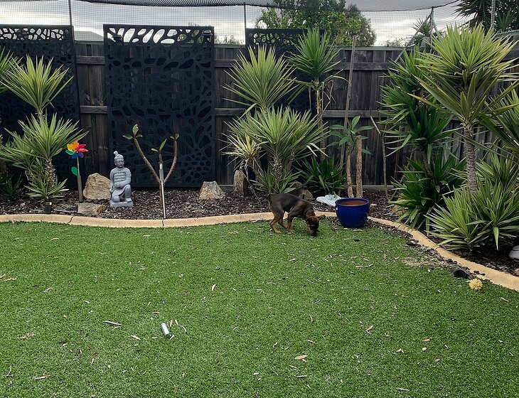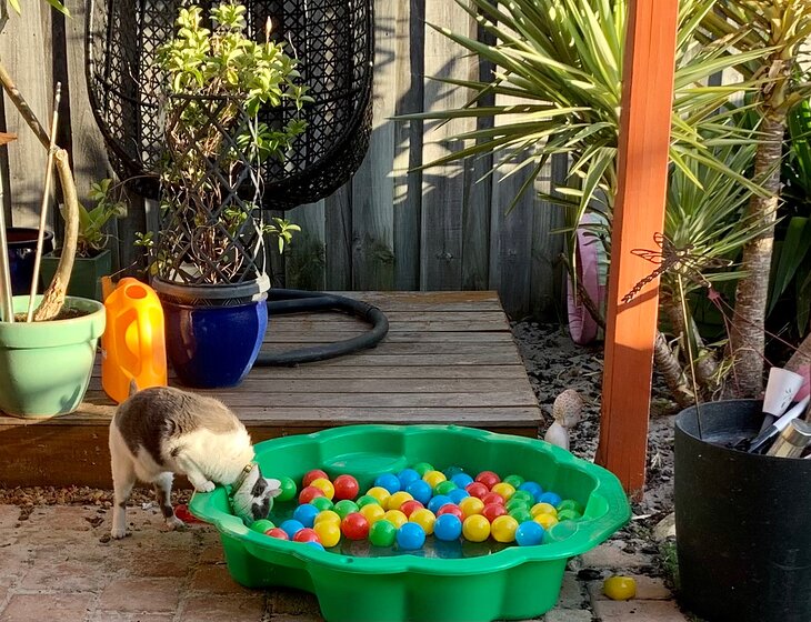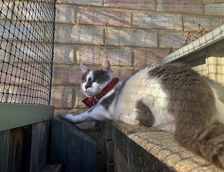 I have a small back garden completely enclosed by a cat run, with fake grass and small amount of plants.