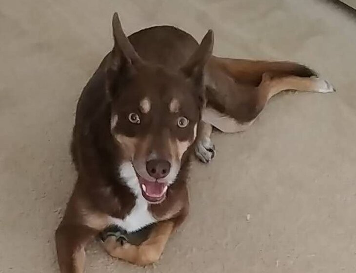 Mon – 15-year-old Kelpie, gentle and sweet; she has cataracts and needs a little guidance when walking to and from the backyard