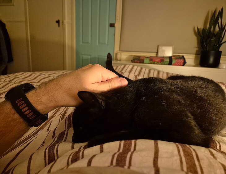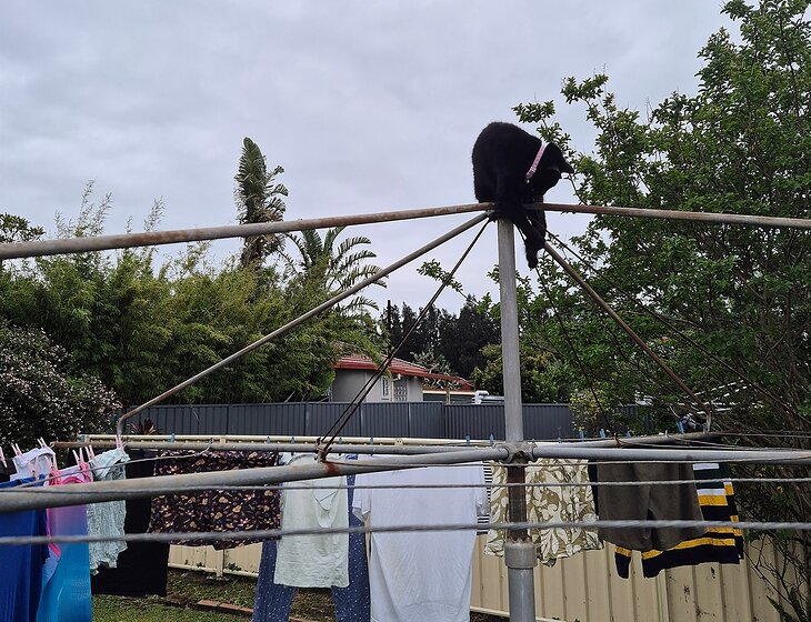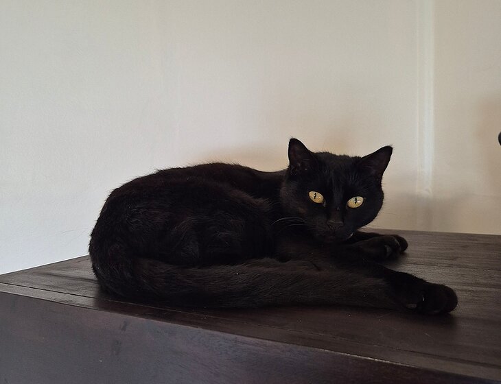 We have one little 8 yr shorthaired black cat called Inka that roams inside and out. She gets locked in at night and let out in the morning. She likes attention but is also happy to roam outside for most of the day. She eats dry biscuits throughout the day so you just need to make sure her bowl is filled up ever 1-2 days. She gets treat sachets ever 3-4 days and treats if she does her tricks (simple ones)....or if you need to get her inside at night :)