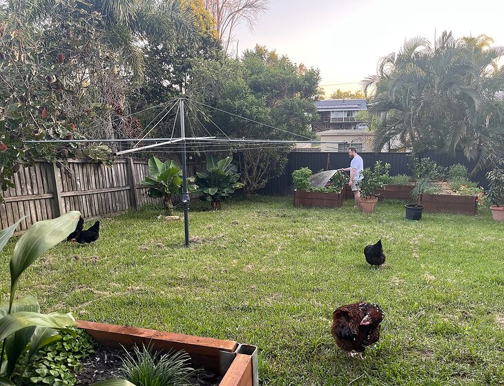 Main duty is looking after our pets (1 cat and 6 chickens) and watering plants and vegie patch.