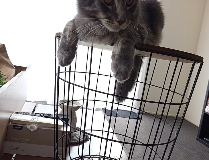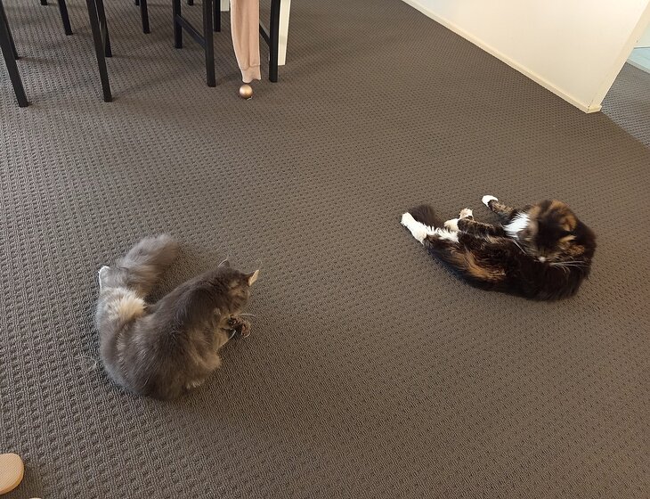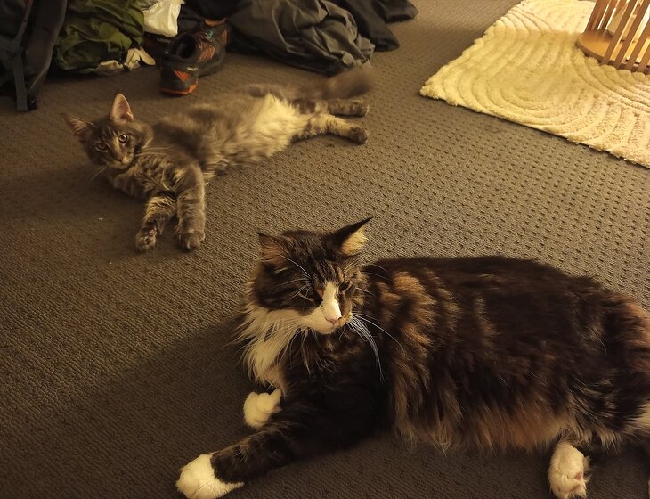We have 2 main coon, 1 called bamboo 6 years old and 1 called Kumo 6 months to take care of. They love to play and cuttle.