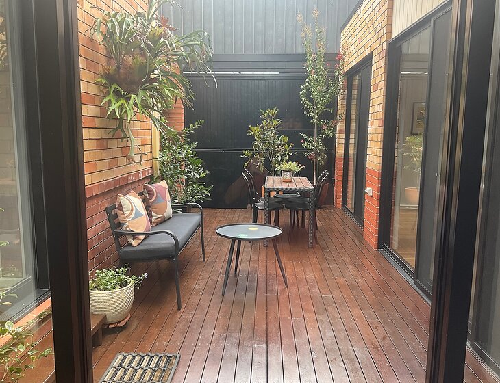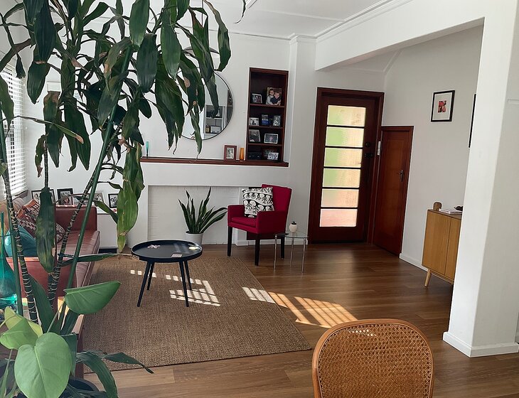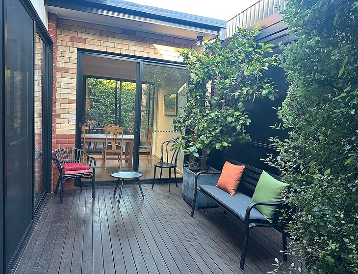 Our heritage listed home, built in the 1930s has been lovingly renovated and extended. There is greenery everywhere you look and both courtyards are visible from inside. We have ducted gas heating and evaporative cooling for the summer months. Our guest bedroom has a King sized bed and visitors have commented on how comfortable it is. Read more...